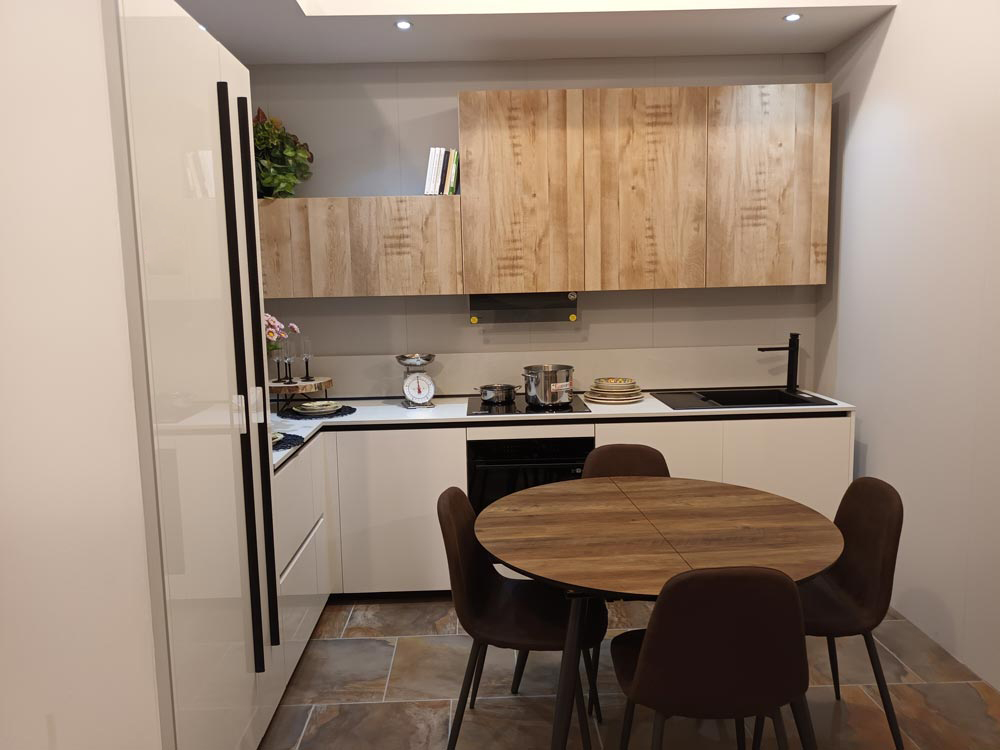 Le ante in laccato bianco lucido riflettono la luce naturale, espandendo visivamente lo spazio e offrendo un’atmosfera fresca e contemporanea. Gli elementi effetto legno di Quercia aggiungono calore e bilanciano l’eleganza del bianco con un contrasto delicato e sofisticato. La configurazione angolare ottimizza lo spazio disponibile, rendendo la cucina non solo esteticamente piacevole, ma anche altamente funzionale e accogliente.
